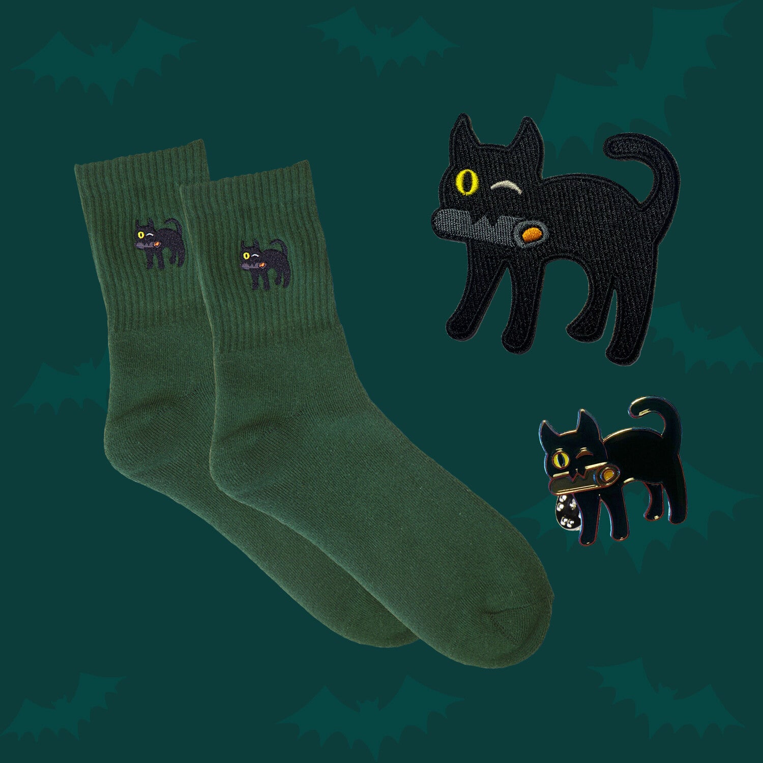 Deze package bevat het Spookpoes met Worstenbroodje embleem met plaklaag, socks (one-size-fits-all voor volwassenen) en de pin, die je herinnert aan die ene nachtmerrie midden in het donkere woud. Maar wees gewaarschuwd, deze items verdwijnen sneller dan je denkt, net als de Spookpoes zelf wanneer hij koers zet naar het volgende worstenbroodje!